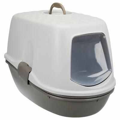 Modern hooded cat litter box with a carry handle, with a hygienic separation system using 2 trays and a sieve for easy cleaning, allowing for economical litter use and with an active carbon filter.