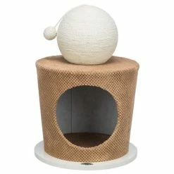 Elegant and versatile: If you are looking for a stylish and imaginative scratching opportunity for your pussycat, the Trixie cave with scratching ball is just what you need. The small but fine scratching furniture scores not only with its noble design in a structured, earth-coloured soft plush look and heavy real wood top, but also with high functionality!