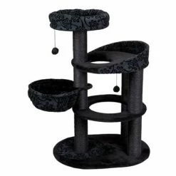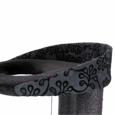 Stylish cat tree for large breeds, with striking black plush and floral velour covers, 8 12cm-diameter sisal posts, hammock, removable bed & rustle base plate. Dimensions: 77 x 58 x 114 cm (L x W x H)