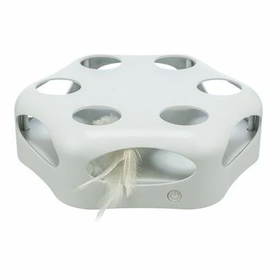 Awaken your cat’s natural hunting instincts with this Trixie Turning Feather Cat Toy, encouraging play and dexterity. Inside this six-edged plastic toy you will find moving feathers, activated by the press of a button to move wildly and unpredictably in changing directions. The different sized openings will encourage your cat to chase around the toy to try to reach inside and grab the feathers.