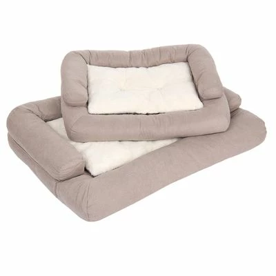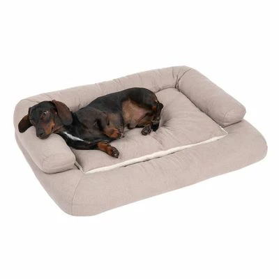 Comfortable dog sofa with high edge, perfect for leaning against and relaxing, low entry, reversible cushion with plush and upholstery fabric, thickly lined, protection against floor cold, easy to clean, colour: taupe
