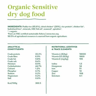 Highly-digestible organic dry food for adult dogs, made with organic chicken and organic rice, suitable for sensitive or sterilised dogs and enriched with organic seaweed and fish oil.
